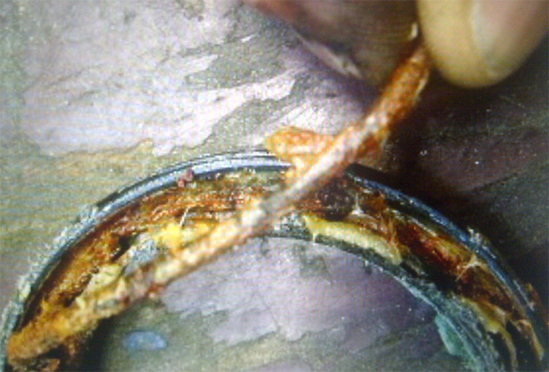 Wir hatten in der letzten Saison immer wieder Wasser unter der Achterkoje. Im Verdacht standen von Anfang an die Simmerringe, die die Ruderwelle im Koker dichten sollen. Bei der Überprüfung im Achterschiff stellte sich dann allerdings auch noch heraus, dass unser Auspuffschlauch in einem erbarmungswürdigen Zustand ist. Also wurde der Schlauch getauscht.