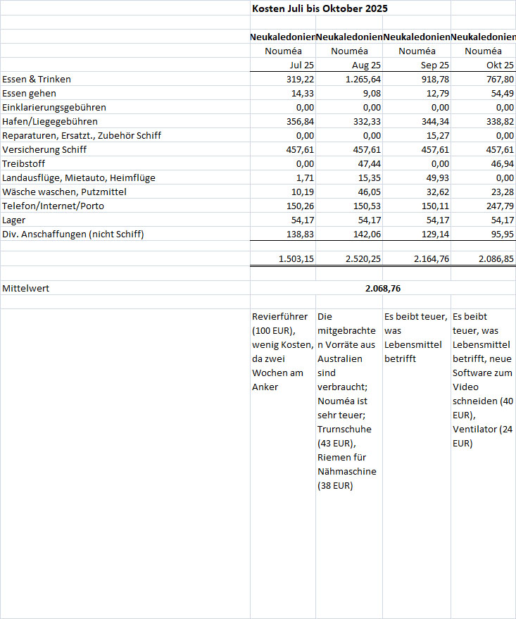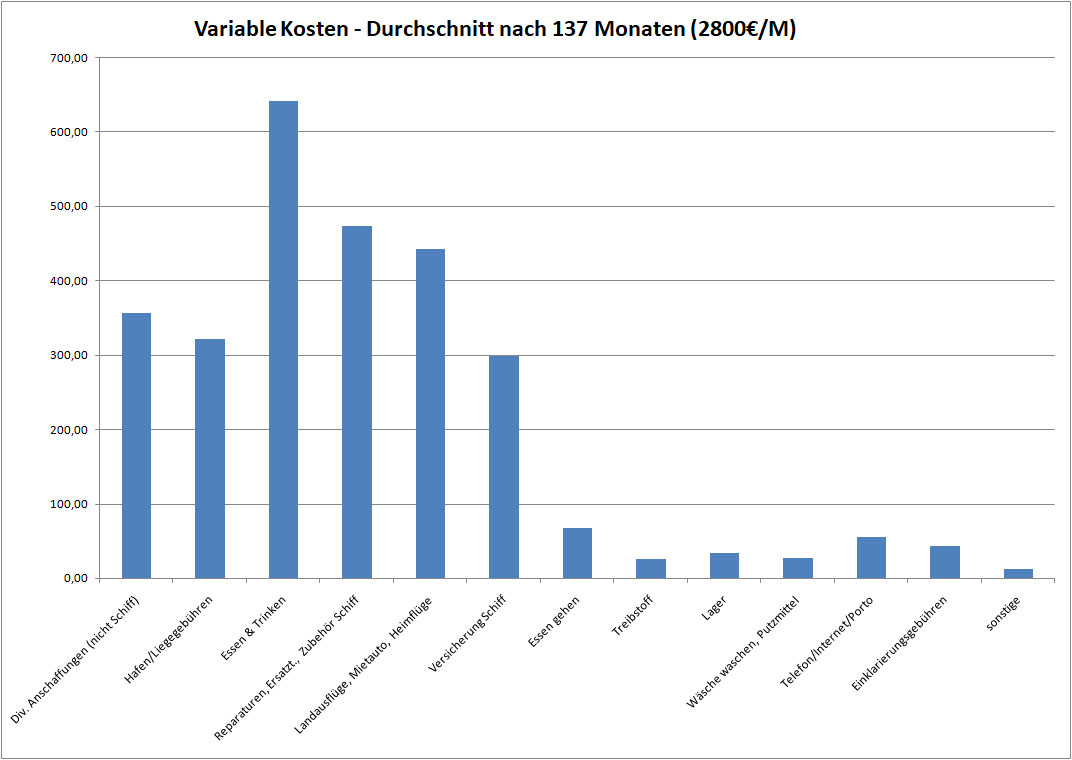 Bevor wir zu unserer Langfahrt aufgebrochen sind, haben wir uns das auch gefragt und wenige Antworten gefunden. Daher haben wir uns entschlossen, unsere Ausgaben monatlich zu veröffentlichen. Dies mag den Blauwasserseglern helfen, die ebenfalls eine Weltumseglung oder Langfahrt planen.