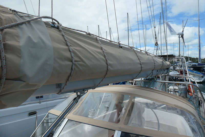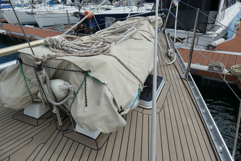 Daher hat Achim experementiert: Unsere Antenne steht im Cockpit auf einem der beiden Ablagefächer neben dem Niedergang. Verdeckt von Bimini, halb verdeckt von der Sprayhood. Je nach Segelkurs sind sogar noch Baum und Mast im Weg.