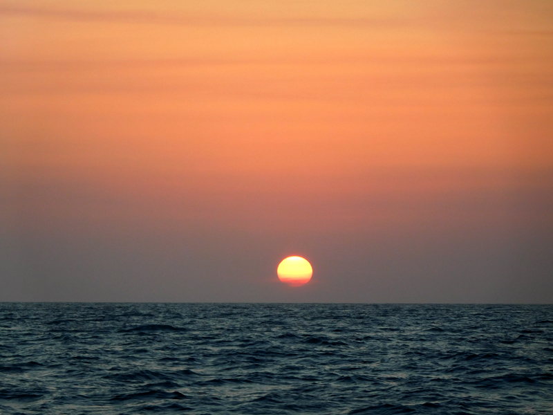 Unseren Rhythmus, den wir bereits vor Monaten gefunden haben, behalten wir bei: Nach dem Abendessen lege ich mich um 20:00 Uhr hin. Um 22:00 Uhr beginnt meine Nachtwache bis 02:00 Uhr, danach ist Achim dran, bis 6:00 Uhr. Waehrend ich dem Sonnenaufgang zuschaue, schlaeft er ebenfalls noch mal zwei Stunden bis 8:00 Uhr. Somit sehen wir uns schon mal 12 Stunden gar nicht. Die Wechsel in der Nacht erfolgen wortkarg. „Keine besonderen Vorkommnisse, gute Nacht.“ ![]()