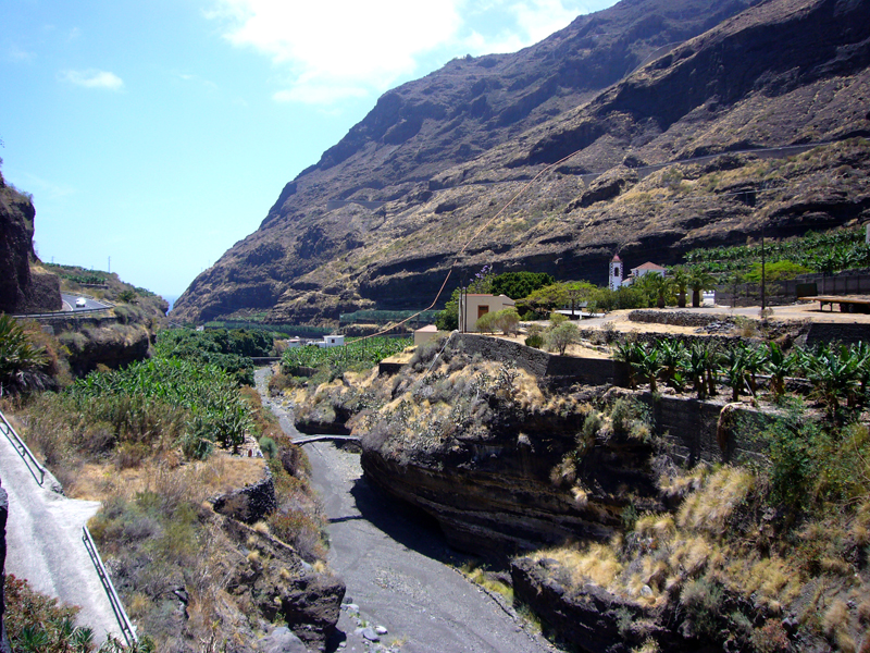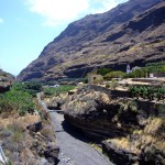 Auch hier soll man prima Wanderungen unternehmen können. Wir wollen schauen, ob das nicht eine Idee für Morgen sein könnte. Aber die Schlucht gefällt uns überhaupt nicht. Bananenplantagen, geschützt mit Flies oder Mauern gegen den Wind. Wasserleitungen, Wasserauffangbecken, Bagger, karge Felswände, Staub und ein versiegter Fluss geben ein unschönes Bild ab.