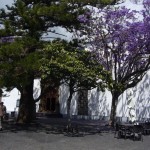 Der Bärenhunger ist noch nicht wirklich da. Daher setzten wir uns gemütlich unter die schönen Jacarandas und knabbern an unseren mitgebrachten Brötchen.