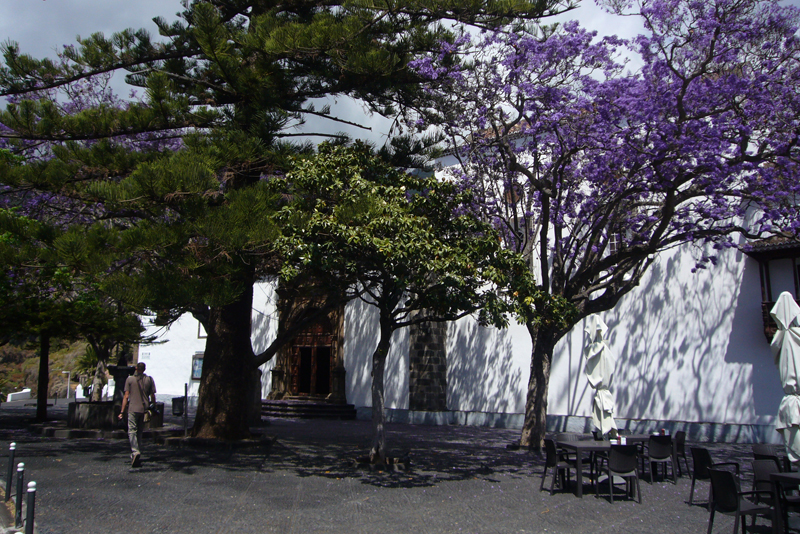 Die Kirche für Nuestra Señora de las Nieves – „unserer Frau vom Schnee” ist in einem winzigen Dorf hübsch gelegen zwischen Brunnen und gerade üppig blau blühenden Palisanderholzbäumen (Jacaranda).