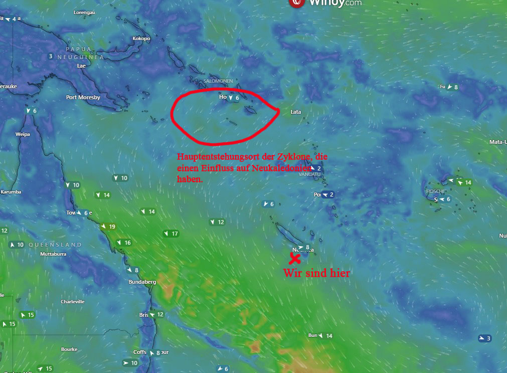 Zyklone, die Einfluss auf Nouméa haben, entstehen fast ausschließlich in der Salomonensee, östlich von Papua-Neuguinea. Das ist ungefähr 2.000 Kilometer entfernt. Ein typischer westpazifischer Zyklon legt 300 bis 700 Kilometer pro Tag zurück. So ein Wirbel kann innerhalb von vier bis sechs Tagen vor der Tür stehen.