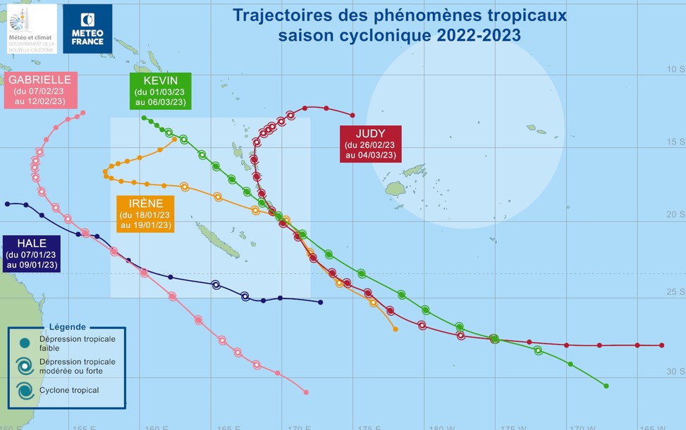 Zyklone in der Saison 2022 2023: Gabrielle hatte die rosafarbene Zugbahn. Fast immer entstehen die Zyklone, die Neukaledonien beeinflussen in der Salomonensee (seltener in der Coral Sea). [Quelle ‚Meteo France‘]