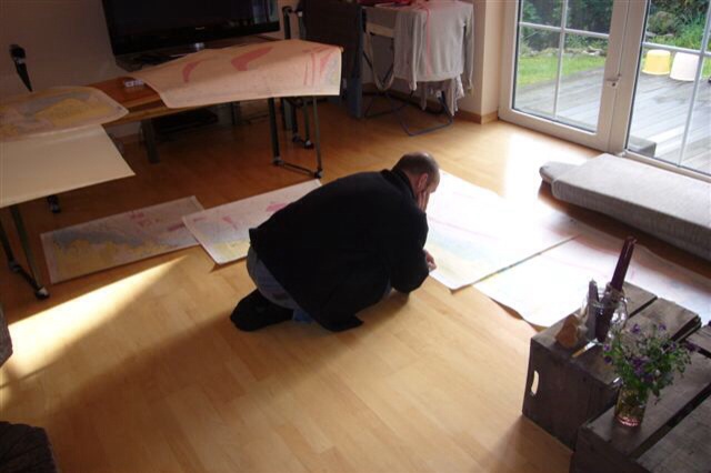 Zwischendurch haben wir auch ein wenig Zeit uns mit der ersten geplanten Etappe zu beschäftigen. Man ein Glück, dass alle Möbel weg sind, so haben wir genug Platz, um die Seekarten auszubreiten.