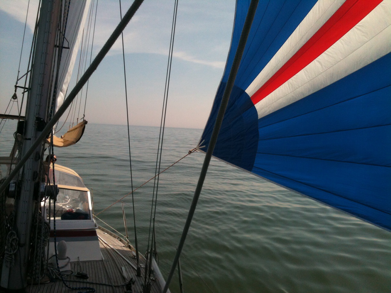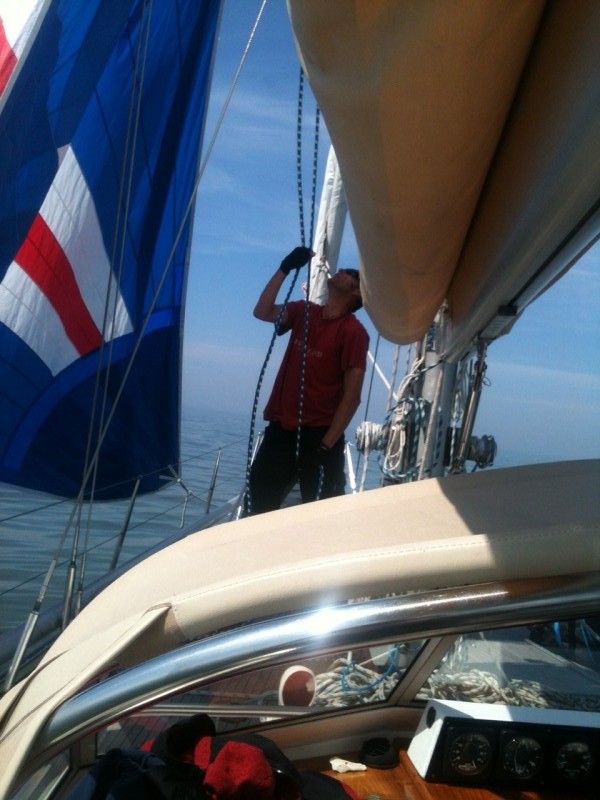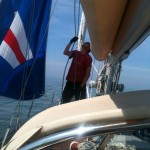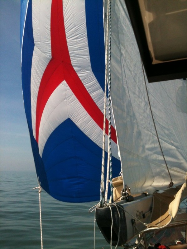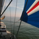 mit wunderbarem Segelwind, moderat und leicht von achtern, sind wir bei strahlendem Sonnenschein die 36 sm (ca. 70 km) nach Helgoland gereist. Wegen der guten Verhältnisse konnten heute gleich unseren Blister (Leichtwindsegel – die hübsche, bunte Blase, die immer vorne am Bug eines Segelbootes schwebt) einsetzen. Für uns neu war der Bergesack, den wir uns vor der Reise noch gekauft hatten. Das hat aber bestens funktioniert, die 120 qm Tuch in die 17 m lange Hülle zurück zu bekommen.
