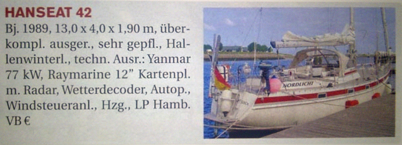 Als ich eines Tages die Yacht (6/2009) durchblätterte, stolperte ich über die Anzeige für eine Hanseat 42. Ich kannte das Schiff zwar nicht, aber es klang so interessant, dass ich dachte … “wir können uns das Schiff ja mal ganz unverbindlich ansehen”