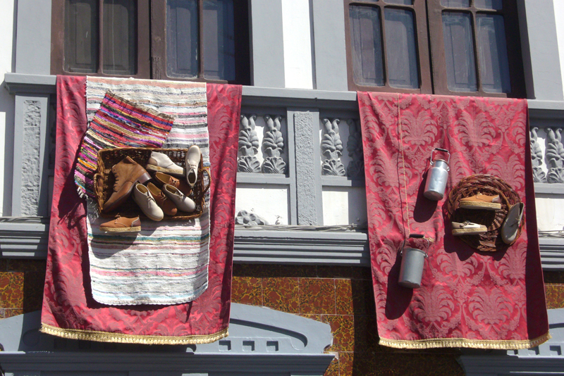 Diese sind entweder schlicht oder geschmückt mit Brot, Milchkannen, Schuhen oder sonstigen Haushalts-Gegenständen. Offizielle Gebäude hängen mit Wappen bestickte Tücher an die Balkone.