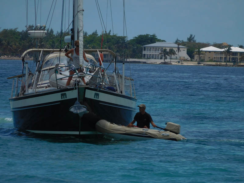 Nun folgt doch die Anker-Nummer. Bis kurz vor der Sinkgrenze wird unser Dinghy mit Anker und Kette beladen. Vor dem Bug von Balou wirft Achim den Anker aus dem Dinghy und tatsächlich, es funktioniert. Mit der elektrischen Ankerwinsch und Maschine kann Balou sich am eigenen Anker vom Sandhaufen ziehen.