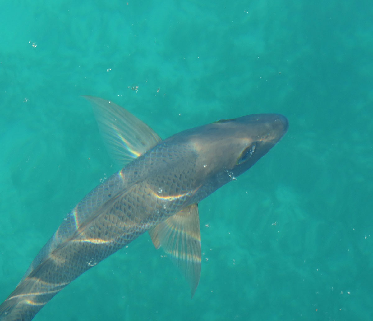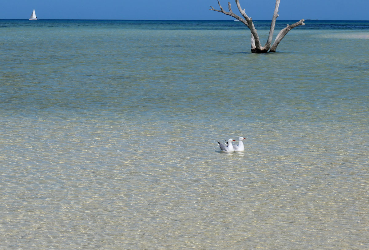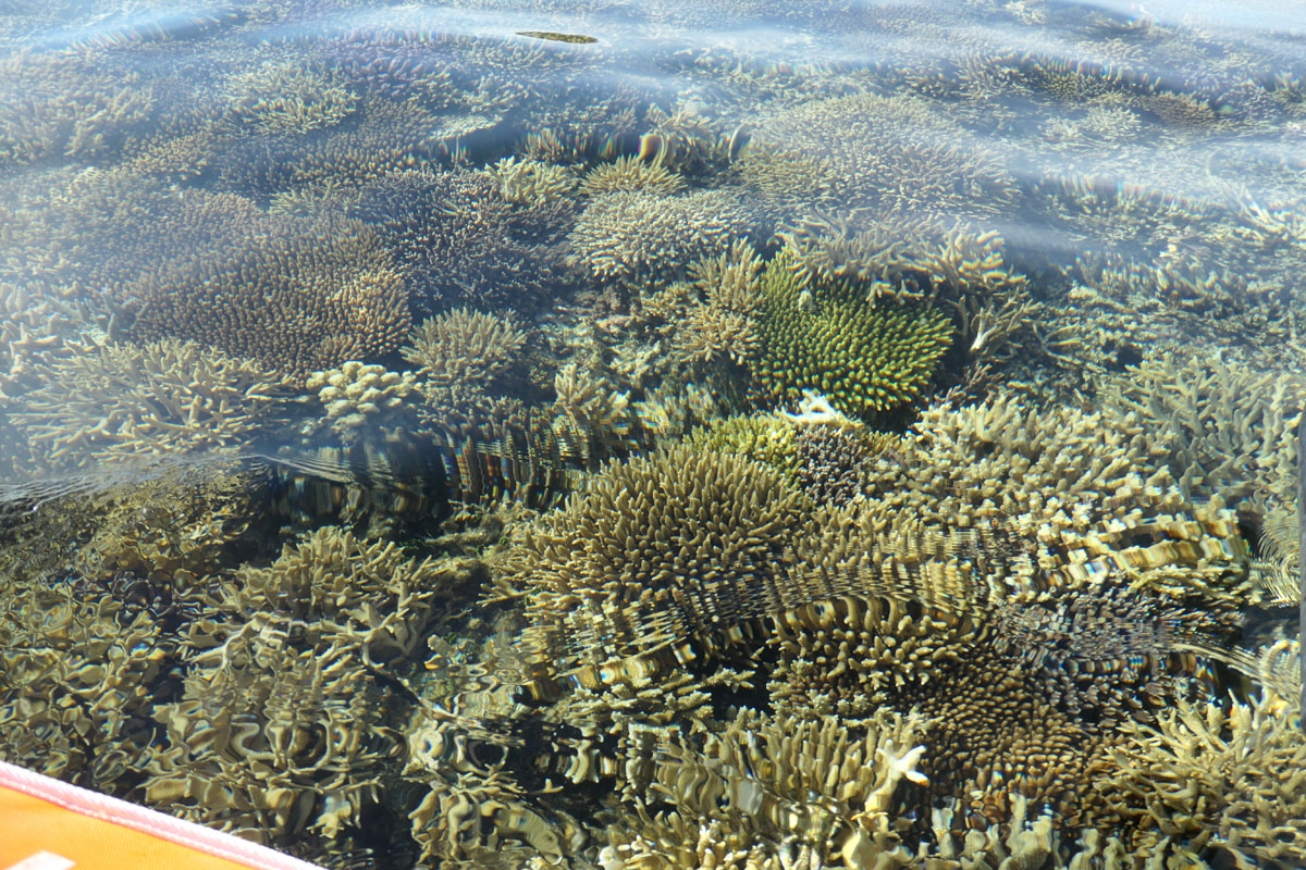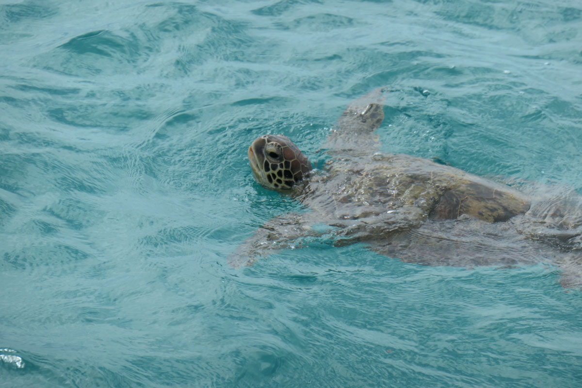 Die Korallenbänke sind gesund und leuchten unter Wasser. Perfekte Schnorchelbedingungen. Sieht man von der Wassertemperatur ab. Noch immer keine 24 Grad. Zu kalt, um längere Zeit ohne Neopren zu schnorcheln. Der Fischreichtum beeindruckt. Große Teile der Lagune sind Schutzzonen, Fischen verboten. Die Rifffische danken es mit stattlichen Größen. Dazu die unfassbare Menge an Schildkröten. Wir sehen so viele Panzer, dass wir trockenen Fußes, von Kröte zu Kröte hüpfend, an Land kommen könnten.