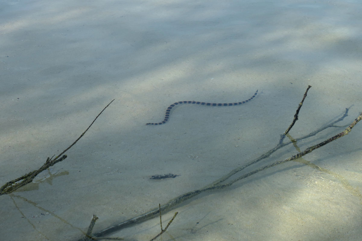 Und immer wieder Seeschlangen. Auch neben dem Boot und beim Tauchen. Von Australieien hören wir die Geschichte, dass sie in ihren Lenzrohren im Cockpit hoch gekommen sein sollen. Gerne klettern sie auch in Kajaks, wenn diese an Land lagern. Kontrollen sind angebracht.