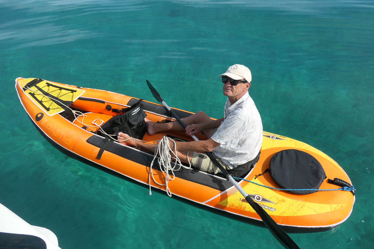 Unser Dinghy brauchen wir gar nicht. MIt dem aufblasbaren Waka kommen wir überall gut hin. Mit zehn Zentimeter Tiefgang können wir herrlich über die Korallen gleiten.