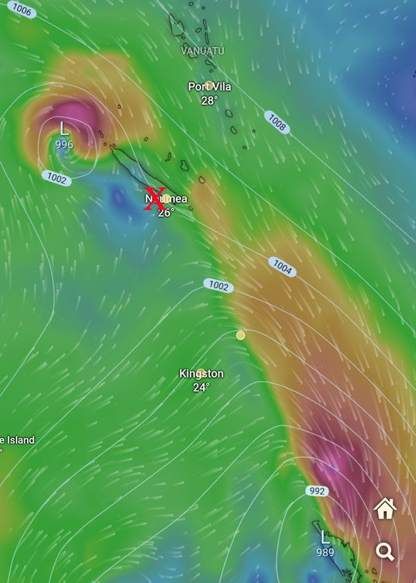 Das „große Rote“ hat sich nicht zu einem Zyklon aufgebauscht. Es stand zeitweise kurz davor, blieb aber letztendlich bei „Invest 96P“. Die Ankunft vor Ort hat sich um einen Tag verzögert, die Windrichtung war dadurch für Nouméa sehr glücklich.