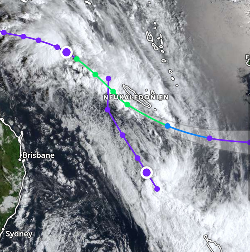 Während alle Aufmerksamkeit auf Neuseeland gerichtet ist, hat sich im Norden von Neukaledonien „Invest 99P“ angeschlichen. Nur ein kleiner Knopf im Wolkenmeer. Schnell in der Entstehung, kaum Vorwarnzeit. Nur zwei Tage nach 96P erreicht uns erneut ein Tropical Storm.
