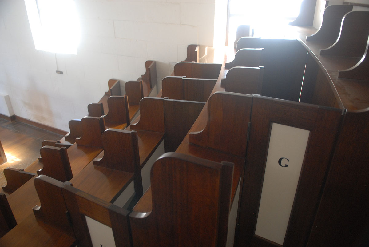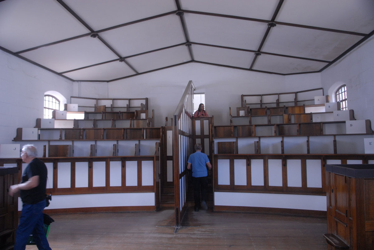 Der Blick von der Kanzel auf die engen Einzelzellen für die Gefangenen. Es geht doch nichts über barmherzige Priester.