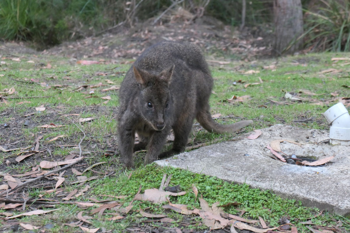 Erste Tier-Begegnung auf dem Campingplatz – ein Potoroo. Niedliche Kängurus mit sehr kurzen Armen.