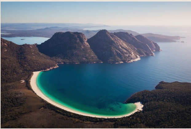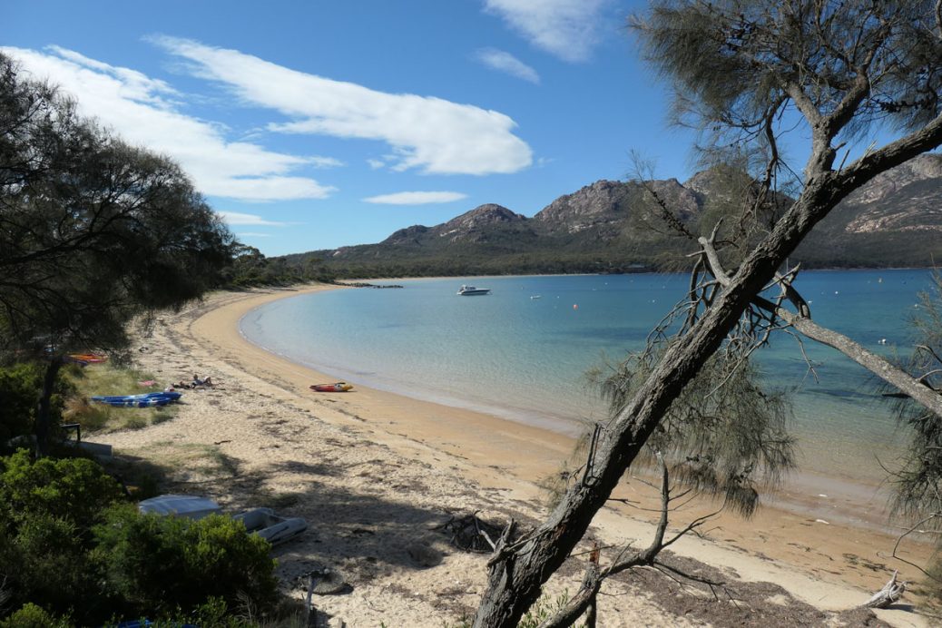 In vielen Ranglisten wird die Wineglass Bay unter die Top 10 der schönsten Buchten der Welt gezählt. Warum sie diesen Namen trägt, ist unklar. Ist es die perfekte Sichel, die an einen Weinkelch erinnert? Oder stammt der Name aus einer weniger romantischen Vergangenheit — vom Blut der Wale, die hier früher abgeschlachtet wurden und das klare Wasser wie Rotwein färbten?