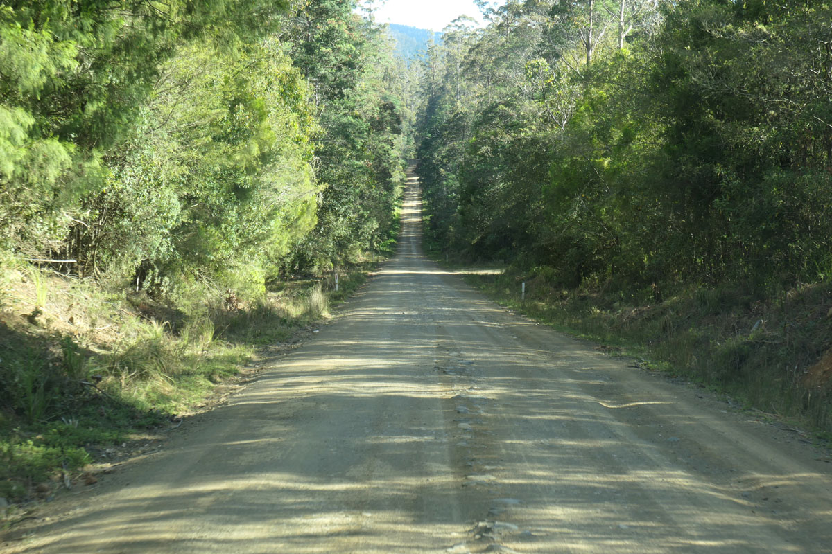 Unsere erste Schotterpiste – 40 Kilometer Wald, statt 80 Kilometer Highway. Könnte auch jedes Wohnmobil fahren, ist aber nicht erlaubt.