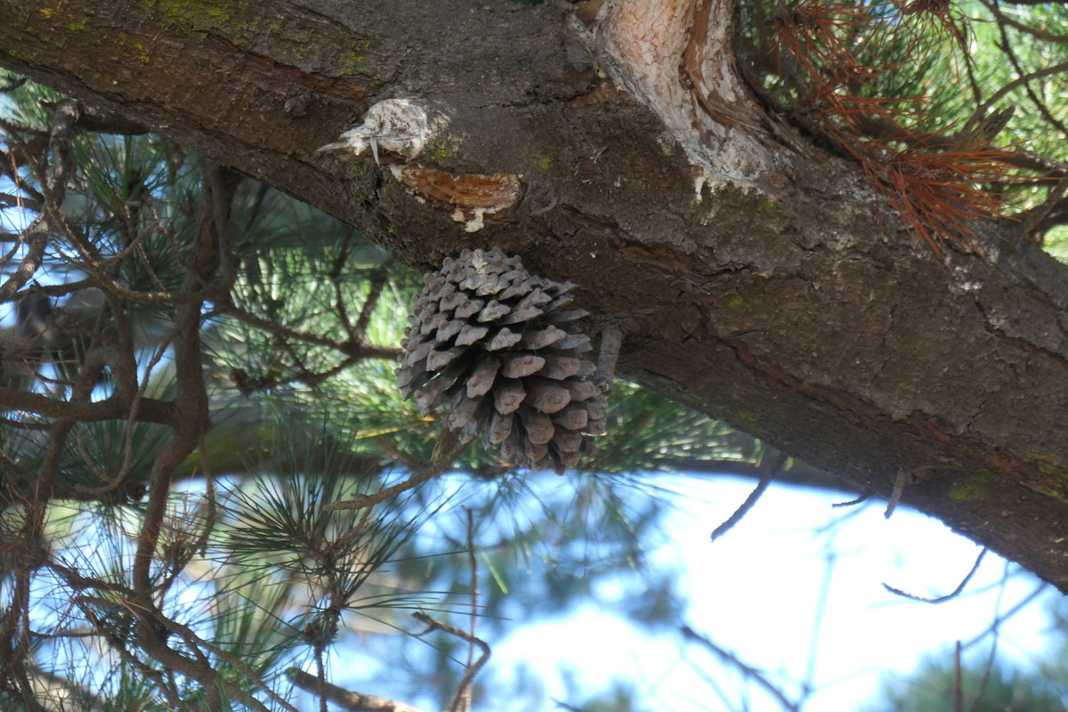 Am Ufer stehen Kiefern mit Handball großen Zapfen. die direkt an dicken Ästen wachsen.