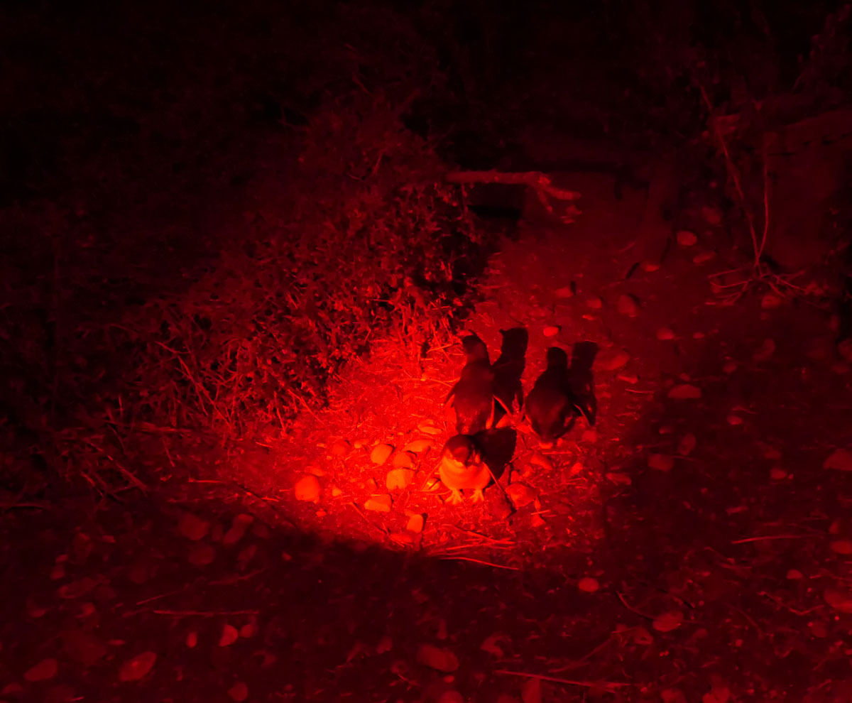 Pingse im Rotlicht. Das stört sie überhaupt nicht in ihrem normalen Verhalten. Weißes Licht und laut sprechen, ist verboten. Fühlt sich ein ankommender Pinguin gestört, kann es sein, dass er ins Wasser zurück geht und sein Junges Hunger schieben muss.