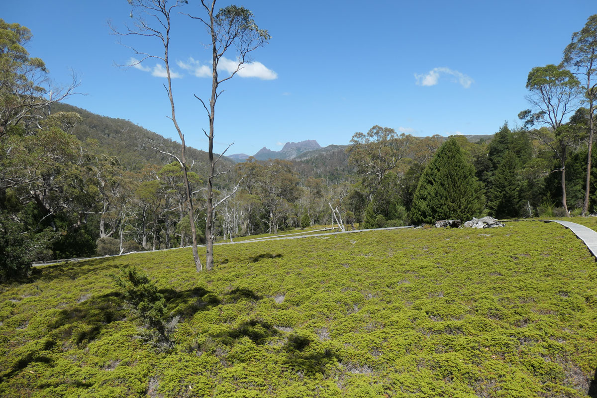 Cradle Mountain im Hintergrund – die grüne Wiese besteht aus Farn.