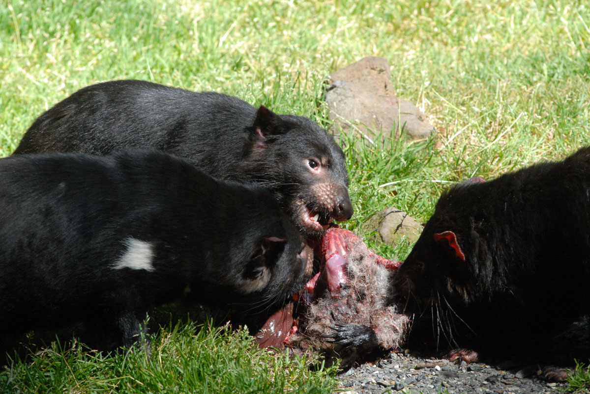 In der Sanctuary gehört zum Eintrittspreis eine einstündige Führung mit Erklärung über die Teufel und Qualls und die Arbeit die dort geleistet wird Höhepunkt ist die Fütterung. Die Teufel sind überwiegend Aas-Fresser. Hier ein bisschen Wallaby.