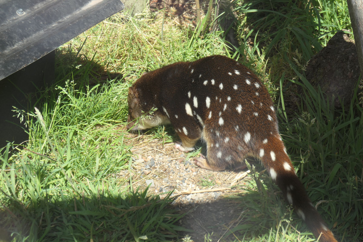 Dieser Tüpfelbeutelmarder – keine Punkte auf dem Schwanz – ist wie ein aufgezogenes Stofftier durch sein Gehege geflitzt.