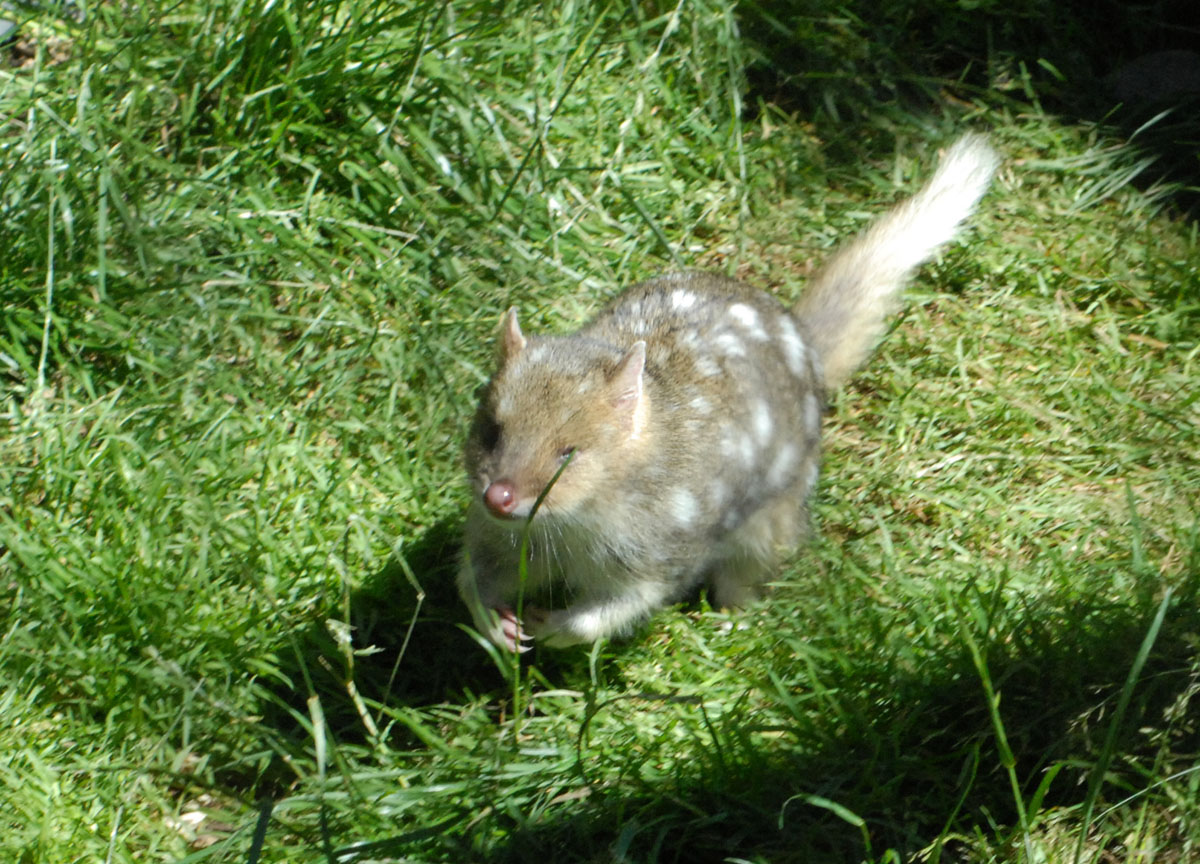 Die Quolls hüpfen in ihren Gehegen wie aufgezogene Plüschtiere umher. Der niedliche Eindruck mit großen Kulleraugen, dem rosa Näschen und gepunktetem Fell täuscht:  Quolls sind das perfekte Beispiel für das Prinzip „Small, but deadly“. Quolls sind hocheffiziente Raubtiere. Während ein Tasmanischer Teufel eher der „Panzer“ ist, der alles mit roher Gewalt zermalmt, ist der Quoll der „Ninja“.