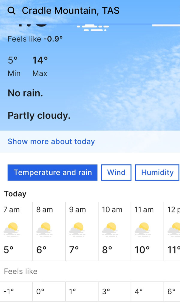 Wettervorhersage nach dem Regen. Die gefühlten Temperaturen waren zum Glück nicht so niedrig. Gute Decken im Auto und ein Heizlüfter haben uns gerettet.