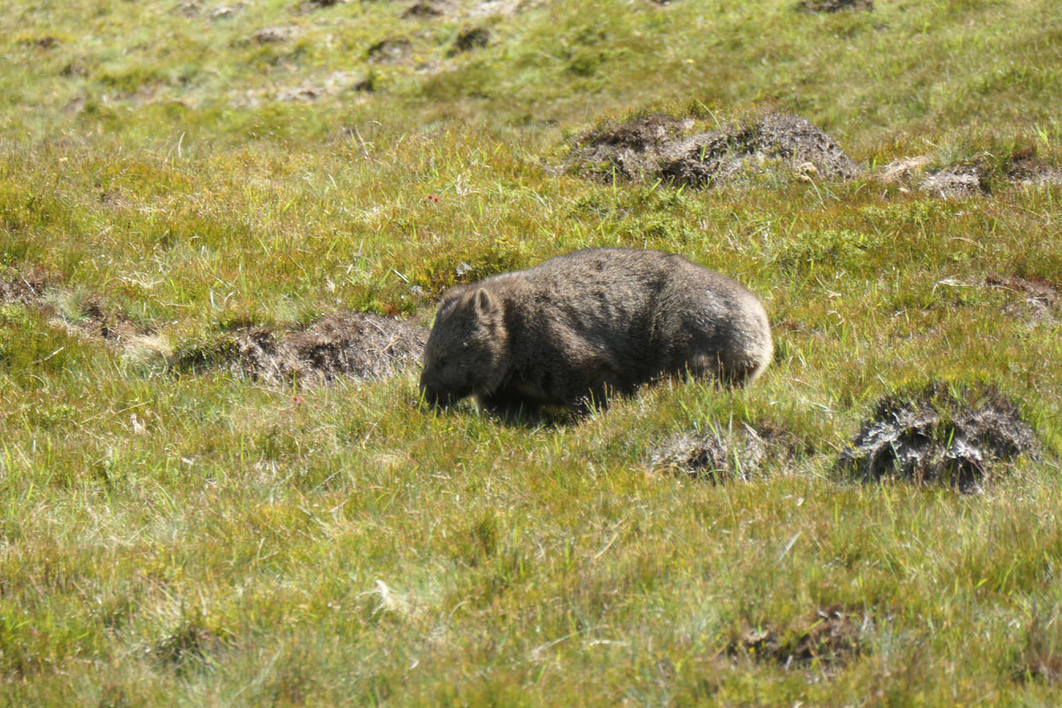 Womats sind nachtaktiv. Manchmal scheint eins keinen Schlaf zu finden. Dann strolchen sie auch tagsüber auf den Wiesen umher.