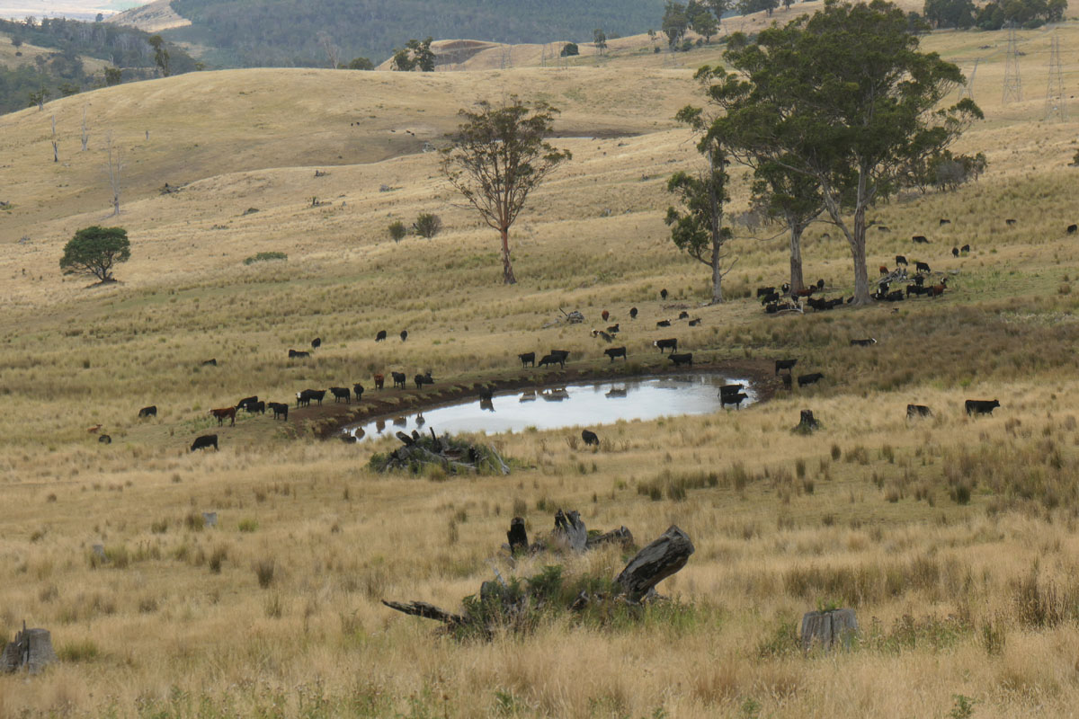 Dass es sich um einen Stausee handelt, ist nicht mehr zu erkennen. Malerisch liegt dieser eingebettet in die hügelige Landschaft der Highlands. Die Waldgebiete liegen hinter uns. Viehwirtschaft dominiert. Früher hauptsächlich Schafe, heutzutage Black-Angus-Rinder. Diese stehen fotogen in der Landschaft und ahnen nichts von ihrer Zukunft: zartschmelzendes Fleisch auf tasmanischen Grills.