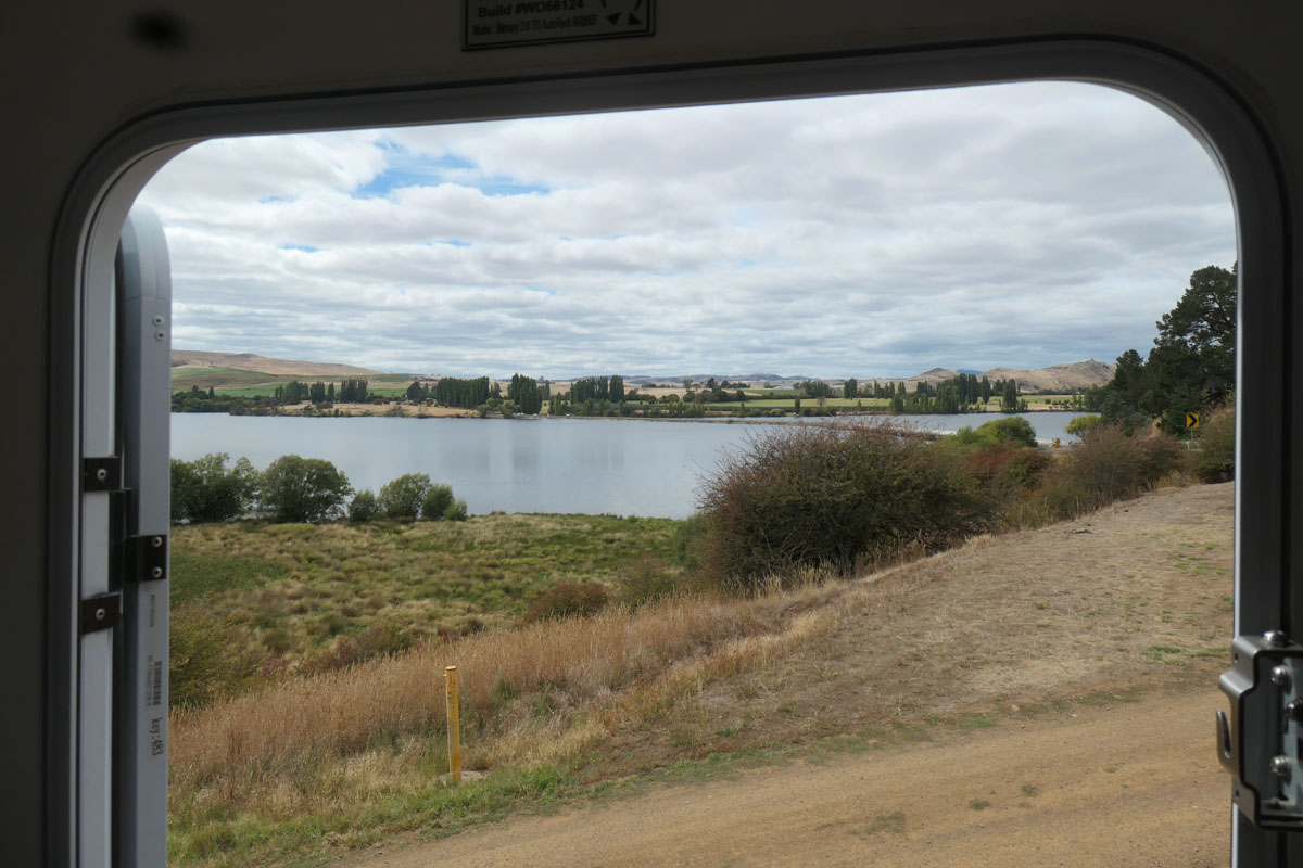 Der Blick aus der Camper-Tür. Der nächste Ort ist acht Kilometer entfernt. Ein netter Platz mit zwanzig Mitcampern auf trockener Wiese.