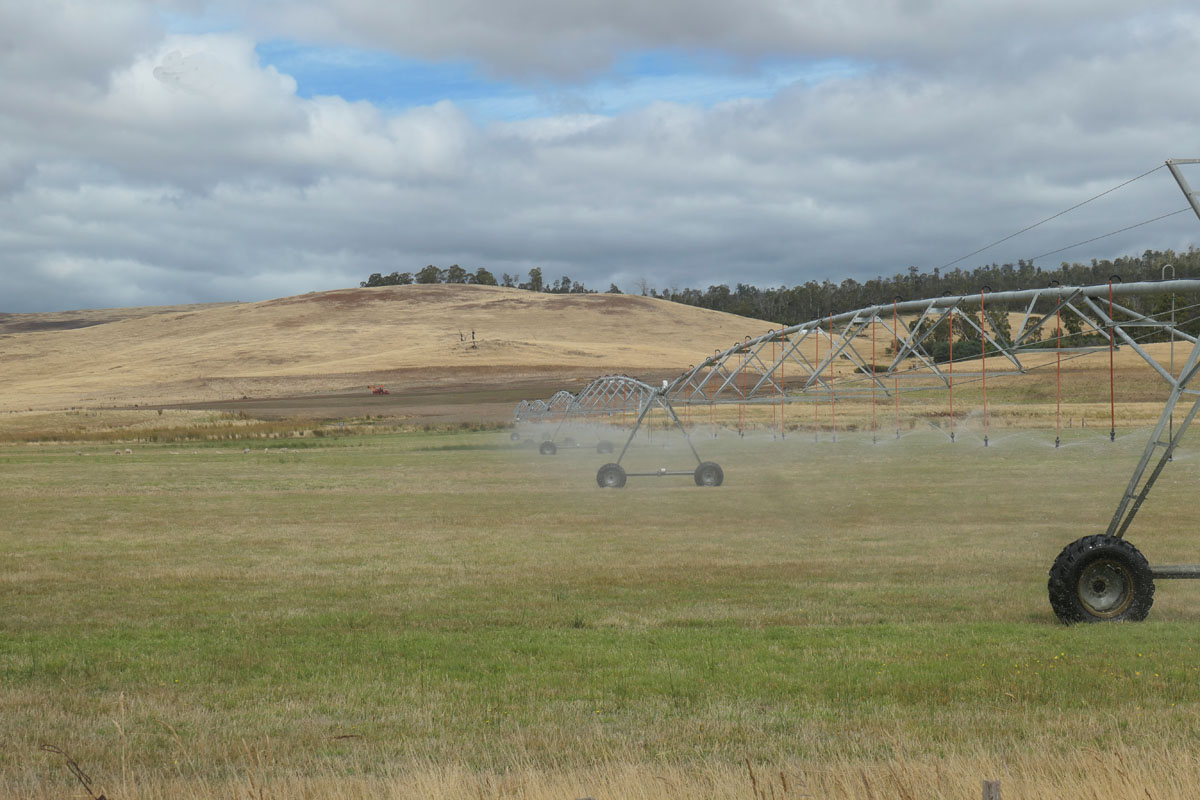 Ohne Bewässerung ist das Gras im tasmanischen Sommer oft braun und im Wachstums-Stopp. Mit Bewässerung kann die Menge der Tiere pro Hektar locker verdoppelt oder sogar verdreifacht werden. Kostenpunkt einer kleinen Beregnungsanlage: 100.000 Euro.