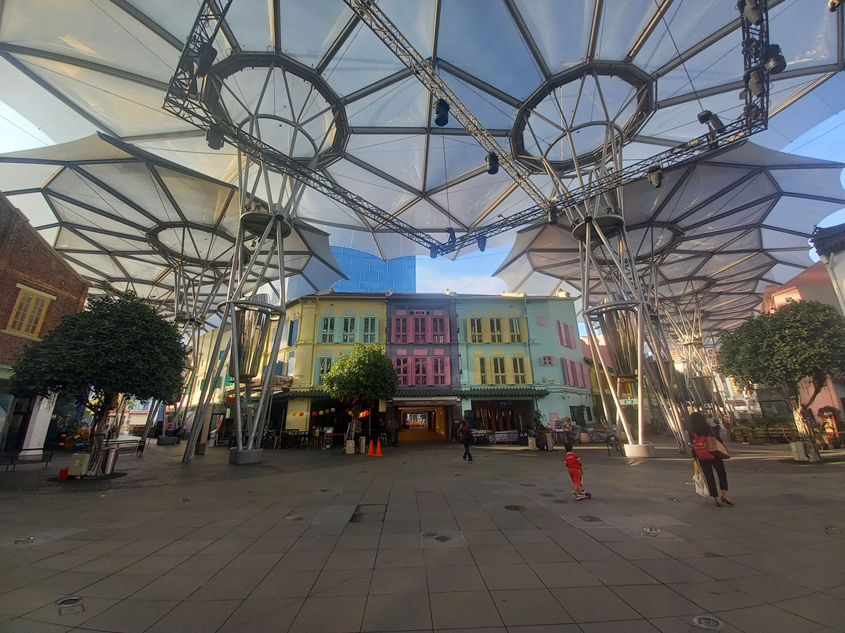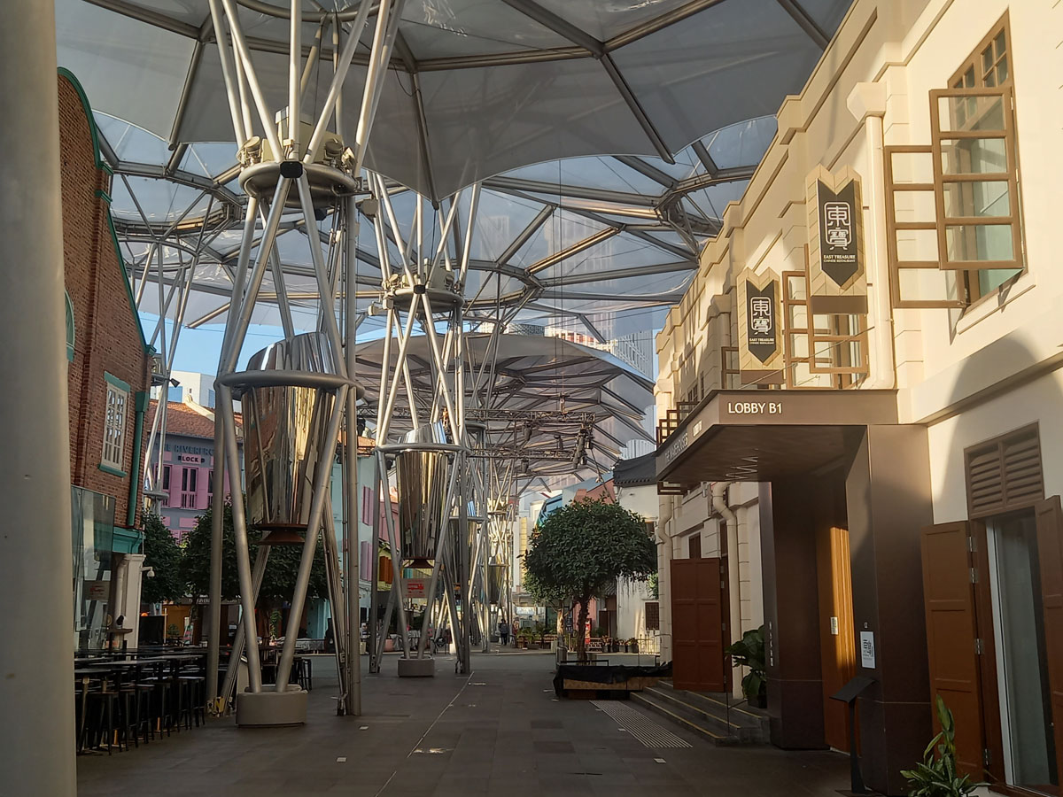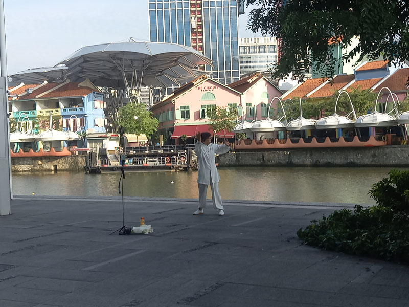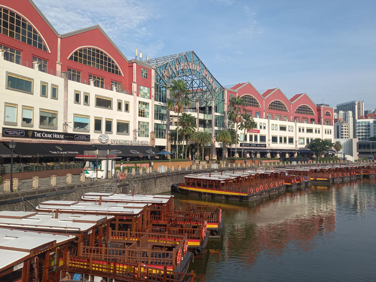 Durch den Park erreiche ich den ‚Clarke Quay‘. Abends ein beliebter Treffpunkt für Touristen und Einheimische, liegt das Viertel morgens noch menschenleer vor mir. Bunte Häuser, Restaurants, Bars – alles direkt am Wasser. Es wirkt wie eine Mischung aus Hafenfest und Instagram-Kulisse.