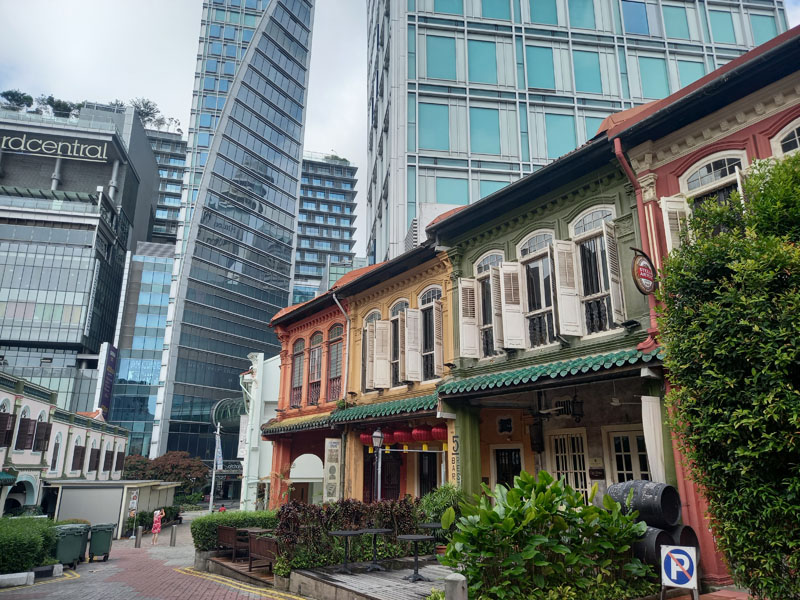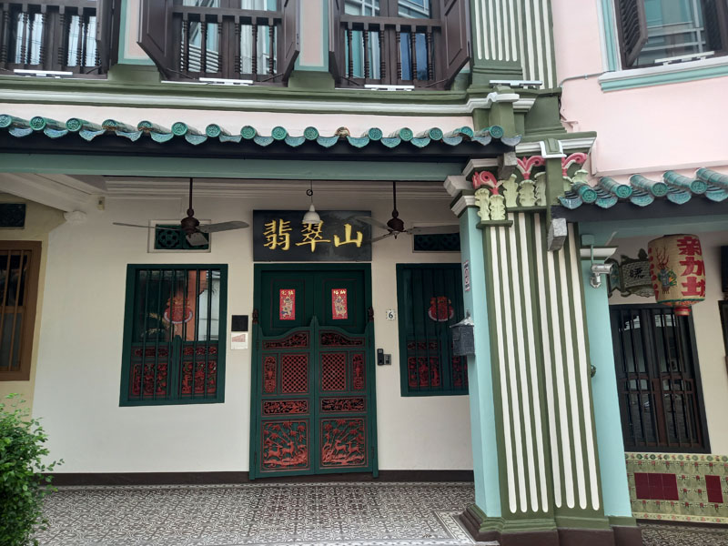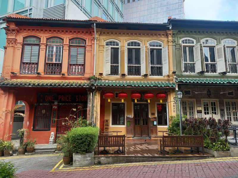 Von diesem ganzen Luxus zweigt eine Seitenstraße ab. Statt vor Glitzerfassaden stehe ich plötzlich vor pastellfarbenen Zuckerbäcker-Gebäuden. Die Häuser wurden um 1900 gebaut und gehören zur Peranakan-Kultur. Chinesische Einwanderer, die malaiische Bräuche angenommen hatten.