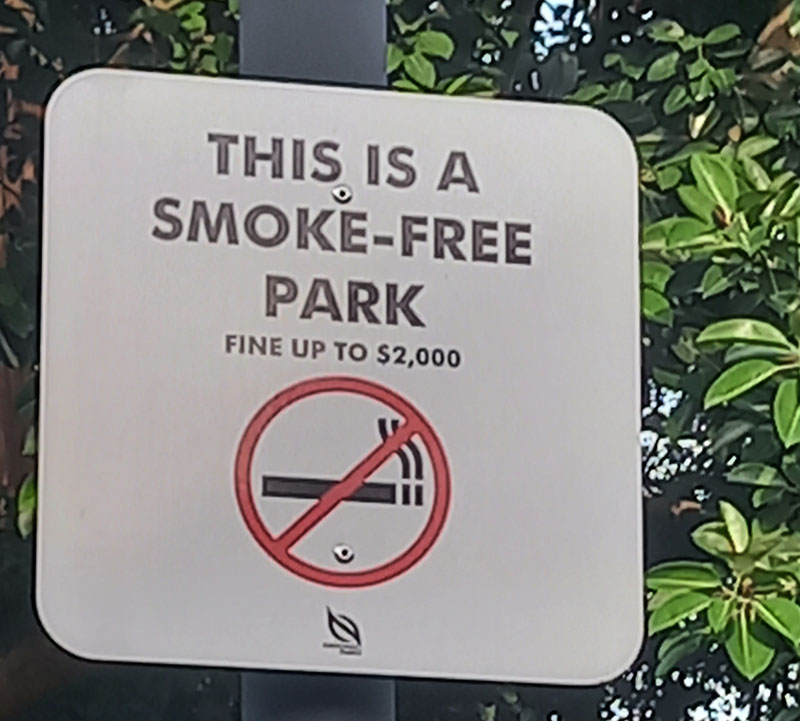 Wer Graffiti sprüht, darf sich auf Stockhiebe einstellen. Drei bis acht Schläge auf den nackten Hintern. Nieren und Gemächt werden mit Polstern vor Verletzungen geschützt. Frauen und Männer über 50 Jahre sind davon ausgenommen. Glück gehabt, bin ich doch vormittags einfach „so“ über die Straße gegangen, weil mir die Entfernung zur Fussgängerbrücke zu weit war. Verboten! Wusste ich nicht und habe satte 100,00 Euro Strafe riskiert. ![]()