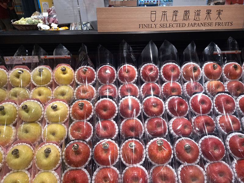Ich schlendere weiter Richtung Hotel. Suche nach etwas Bodenständigem. Nach einem Super- oder Baumarkt. Ich brauche Klebeband, um meinen Koffer zu flicken. Erst als ich fast mein Hotel erreicht habe, werde ich fündig. Ein Edel-Supermarkt. Mit importiertem Obst aus Japan. Fotografieren verboten. Ich mache es trotzdem.