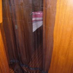 Es ist noch genug Gaze da, um für die Tür einen Vorhang zu nähen. Das Stück ist zwar etwas zu breit und dafür etwas zu kurz, also habe ich es unten einfach ein wenig verlängert. Da hilft Omas Schrägband wieder dabei. Denn ich habe noch zweimal 5 Meter in 5 cm Breite aufbewahrt. (Merke: wenn man seinen kompletten Haushalt auflöst, einschließlich Bett, Geschirr, DVD’s, Bücher und Klamotten, ist wichtig, dass man so eine wichtige Kleinigkeit wie Schrägband nicht nur behält, sondern auch mit aufs Schiff nimmt)
