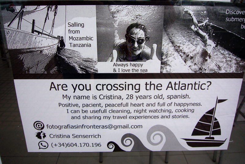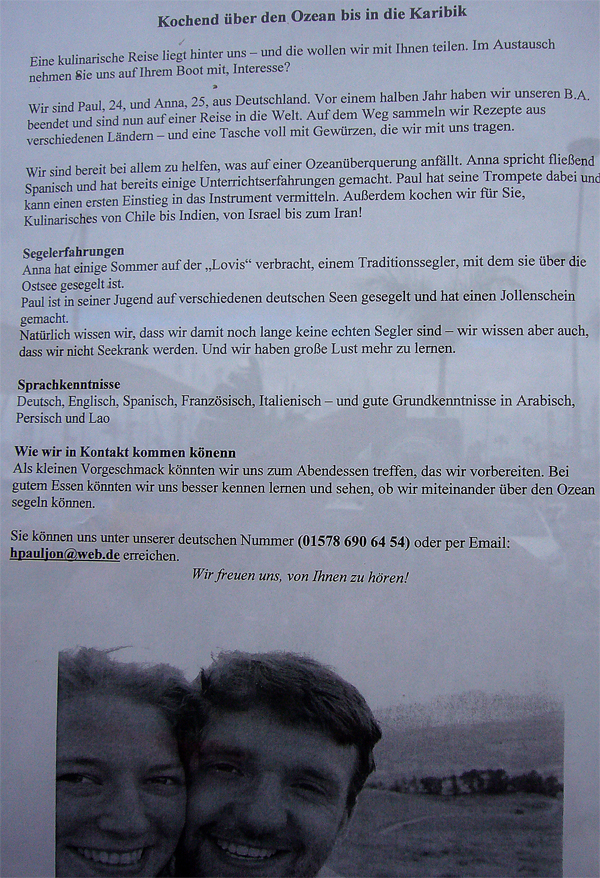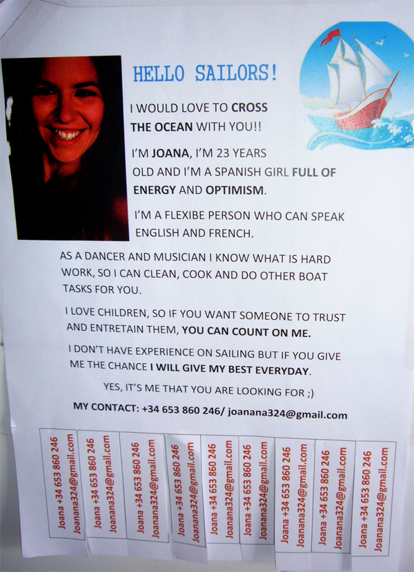 Zur Zeit der ARC, wenn hier am meisten Betrieb ist, sind es bis zu 60 Tramper, die ein passendes Boot suchen. Da jetzt bereits die meisten Schiffe für diese Saison drüben sind, ist die Gemeinde der augenblicklich Suchenden nur ca. 20 Personen stark.