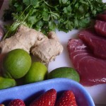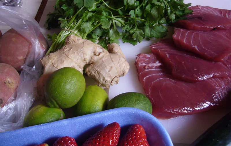 Thunfisch mit Gurkensalat (mit Joghurt, Ingwer und Koriander) und Kartoffelbrei (statt Milch mit Kokosmilch – Idee vom Henssler – mega lecker), die Erdberren gab es schon mittags, die waren aber leider eine Enttäuschung.