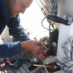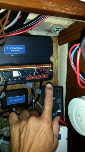 Beim Topplicht war ich mir sicher, dass der Fehler in der Lampe selbst liegen würde und somit habe ich mich zunächst dem schwierigeren Problem gestellt, nämlich dem Nichtfunktionieren unserer Windrichtungsanzeige. Wir haben auf unserem Schiff ein System von B&G (Hydra 330), was zu Zeiten, als unser Schiff gebaut wurde (1989), bestimmt absolut „state oft the art“ war. Die Daten aus den Sensoren auf dem Masttopp, dem Tiefenmesser und der Logge werden alle in eine Zentraleinheit (das Gehirn der Hydra) eingespeist. Von hier aus werden dann die Anzeigeinstrumente mit den notwendigen Daten versorgt. Ich habe mich also zunächst an der Zentraleinheit zu schaffen gemacht und festgestellt, dass eine der drei Spannungen vom Mastsensor, die für die Richtungsanzeige notwendig sind, nicht stimmte.