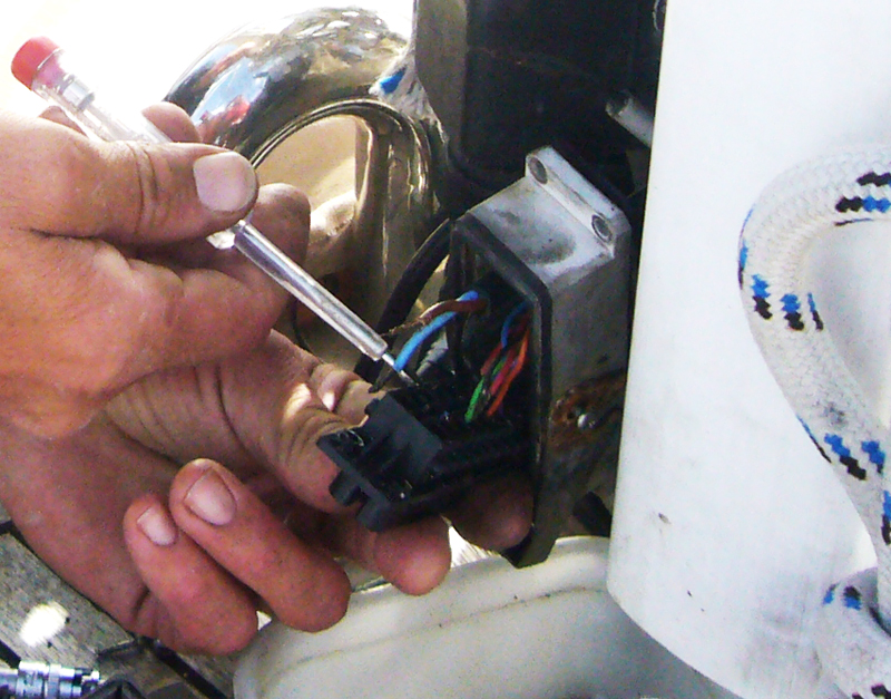 Hier in Santa Cruz sah das alles etwas anders aus. Ein Anruf bei NavTec und am nächsten Tag war ein Techniker an Bord. Kompetent schaute er sich die Verkabelung in der Zentraleinheit an, allerdings ohne einen Fehler feststellen zu können. Also habe ich die Masteinheit vom Masttop geholt und ihm zur Überprüfung mitgegeben. So ganz untätig wollte ich aber nicht bleiben. Ich habe also die Buchse am Mast abgebaut, um mal nach dem Rechten zu sehen. Eigentlich hatte ich erwartet, hier kupferglänzende Kabel vorzufinden, denn immerhin sah der Stecker und die Kabel darin hervorragend aus. Aber was da zum Vorschein kam war schon schrecklich. Korrosion, Schmutz und abgefaulte Kabel. Ich habe also alle Anschlüsse gereinigt, die Kabel neu abisoliert und mit Kabelschuhen versehen und den ganzen Kram wieder zusammengebaut. Erstes Ergebnis war, dass unser Topplicht wieder funktionierte.