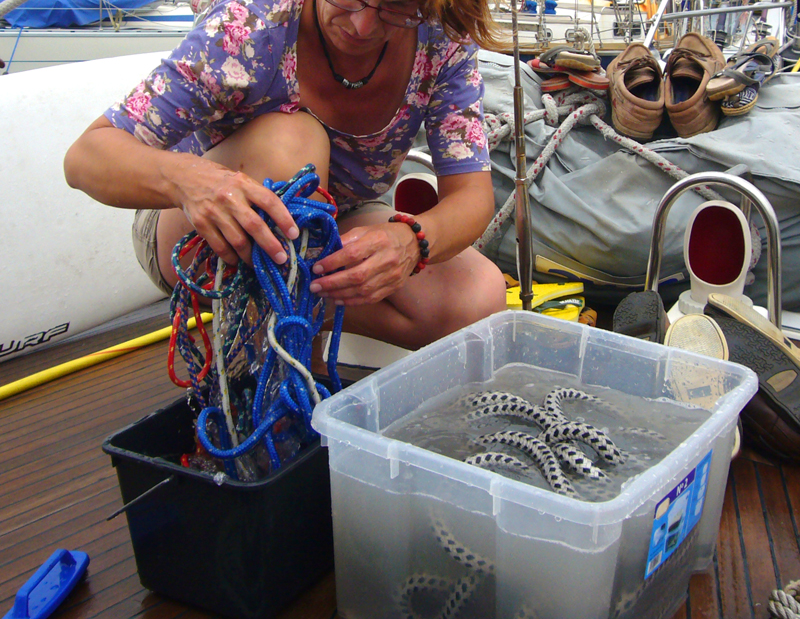 Atanga bekommt von uns die übliche Süßwasserdusche. Und alle Tampen, Schoten, Strippen und Schuhe, die ich zu fassen bekomme, erhalten ebenfalls eine Wäsche.