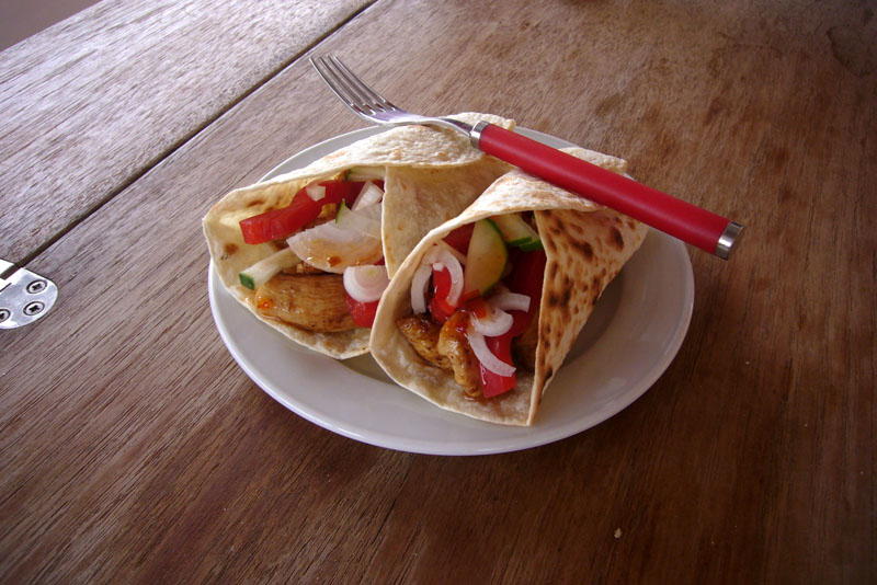 Die Tortilla Shells haben wir beim Lidl gekauft, aber auch im Dino gibt es eine gute Auswahl. Die Hühnerbrust gut anbraten und mit Salz, Pfeffer und einer ordentlichen Portion Cayenne Pfeffer würzen. Die Shells werden einfach in der Pfanne ohne Öl gebräunt. Fleisch mit Paprika, Zwiebel, Gurke und eventuell Möhre in die Shell legen und etwas China Süß-Sauer Sauce darüber geben. Alles nett rollen und schon ist der Snack fertig.