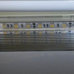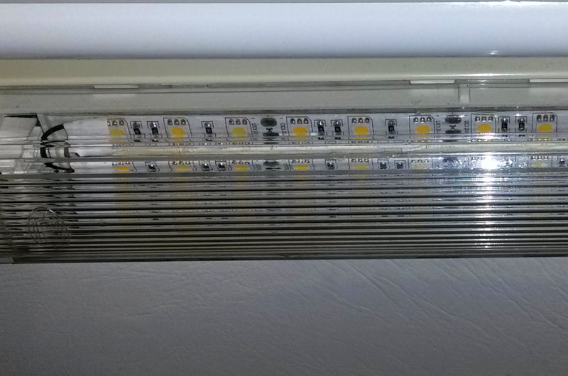 Hier kaufte ich LED Streifen, die ich in die alten Lampen eingeklebt habe. Diese ersetzen und nun die stromfressenden Röhren von damals. Der Umbau war einfach, da nur die Elektrik für die Röhren abgeklemmt und der Schalter neu verlötet werden musste. Der Riesenvorteil dieser Maßnahme war jedoch, dass wir so die alten, formschönen und zum Schiff passenden Lampen behalten konnten .