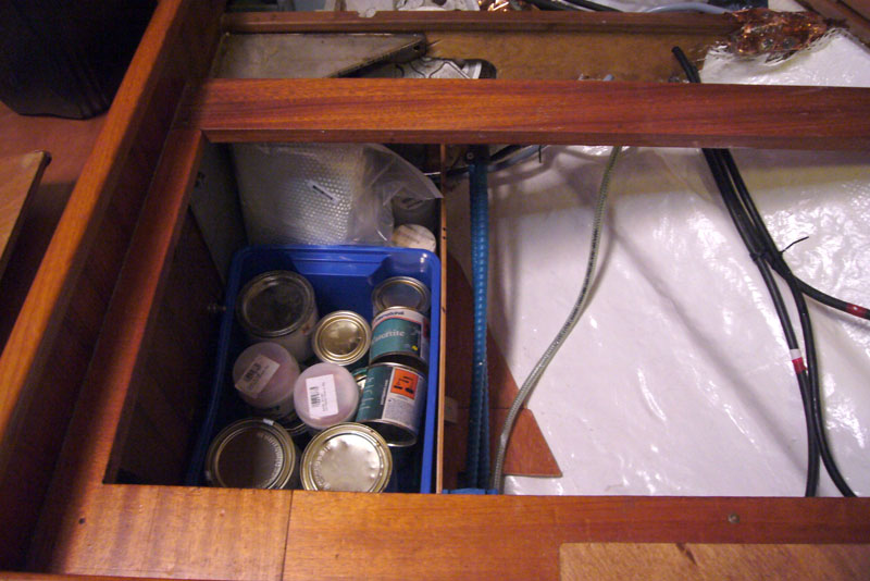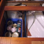 …und zu guter Letzt habe ich den neuen Stauraum im Achterschiff in Beschlag genommen und alles für die Rumpfreparatur nun hier verstaut.
