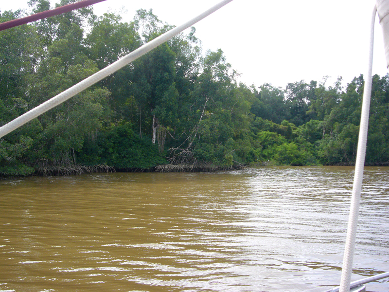 Die Fahrrinne führt aber zeitweise keine 50 Meter vom Französisch Guyanesischen Ufer entfernt. Wir kommen vorbei an Mangroven und üppigem Urwald. Unterbrochen von kleinen Sandstränden an denen im April und Mai Lederschildkröten ihre Eier ablegen werden.
