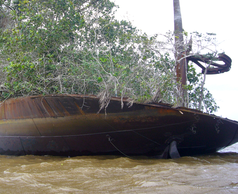 Wir dachten zumindest, dass es eine Insel sei. Bei Hochwasser kaum zu erkennen, zeigt sich bei Ebbe, dass die Insel ein 100 Meter langes Wrack ist.