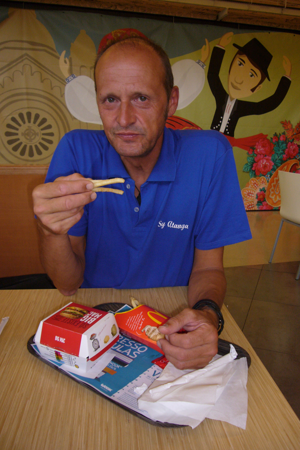Allerdings extrem einseitig in seiner Menüwahl. Während andere Menschen sich an ‚los wochos‘ versuchen, gibt es bei Achim grundsätzlich (der Mann hat Prinzipien) nur eins: das große BigMac Menü mit Cola.